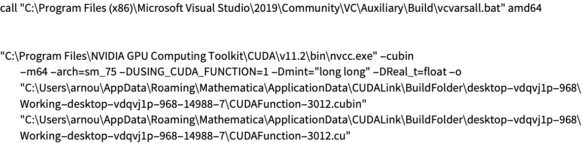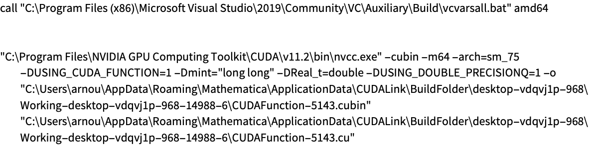 "CleanIntermediate" Automatic whether temporary files should be deleted "CompileOptions" {} compile options passed directly to the NVCC compiler "CompilerInstallation" Automatic location of the CUDA Toolkit installation "CreateCUBIN" True whether to compile code to a CUDA binary "CreatePTX" False whether to compile code to CUDA bytecode "CUDAArchitecture" Automatic architecture for which to compile CUDA code "Defines" {} defines passed to the NVCC preprocessor "Device" $CUDADevice CUDA device used in computation "IncludeDirectories" {} directories to include in the compilation "ShellCommandFunction" None function to call with the shell commands used for compilation "ShellOutputFunction" None function to call with the shell output of running the compilation commands "SystemDefines" Automatic system defines passed to the NVCC preprocessor "TargetDirectory" Automatic the directory in which CUDA files should be generated "TargetPrecision" Automatic precision used in computation "WorkingDirectory" Automatic the directory in which temporary files will be generated "XCompilerInstallation" Automatic the directory where NVCC will find the C compiler is installed