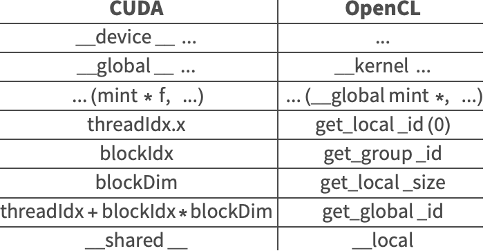 The following table summarizes some of the common changes in the kernel code needed to port OpenCL programs to CUDA.