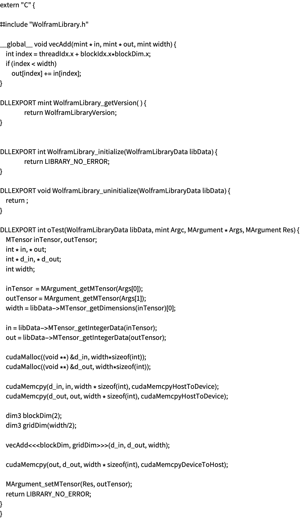 CUDALink provides utility functions that perform common GPU kernel programming tasks as discussed above. With them, you will write your first kernel function.
