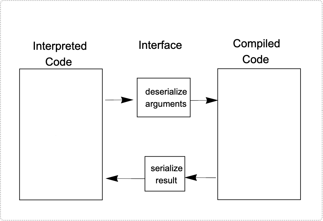 To start exploring compiler support for Wolfram expressions, it is useful to look at the way that compiled functions are called from the Wolfram Language interpreter. When a compiled function is called, the input arguments are converted from expressions into the data required by the function. When the result comes back, it is converted from the data type into an expression. This is known as serialization, and its use for calling compiled code is shown below.