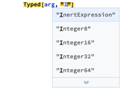 The Wolfram Language notebook interface gives useful help, such as command completion for types in certain cases. For example, when Typed is entered, you may see suggestions such as the following: