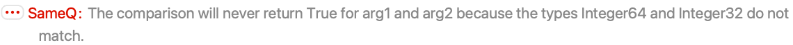 This is also false, because the constant is a 64-bit integer and SameQ is false for different types. A special warning is generated to indicate this: