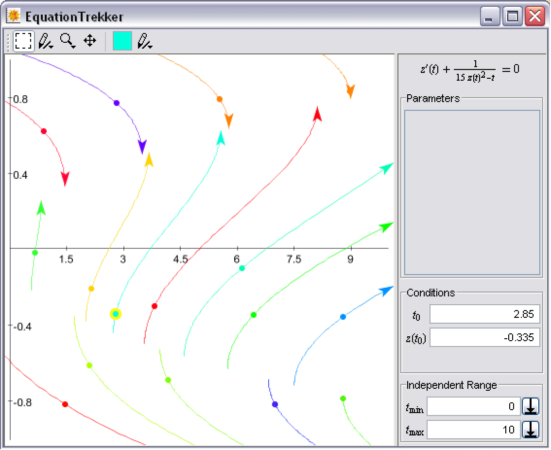 Because of the need to choose conditions in two dimensions, EquationTrekker is limited to one or two first-order equations or a single second-order equation. A system of two first-order equations looks very much like the previous example; in fact, second-order equations are converted to first-order equations. A single first-order equation is somewhat different in that when you click a point, you are in effect choosing the starting value of the independent variable, whereas with two equations, the value of the independent variable is taken to be zero (this can be modified through the graphical interface).
