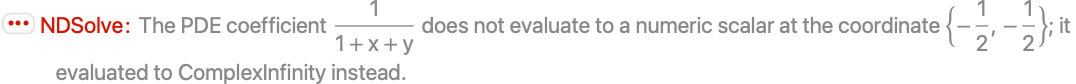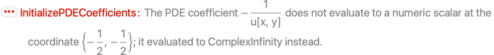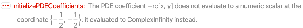 To verify that the coefficients given are adequate for each operator, the coefficients undergo a test evaluation using the initial point in time and a coordinate from the region. If the combination of the coefficient and the used values cancel out, NDSolve cannot detect if a coefficient has not been specified. NDSolve will then give a message that it was not able to compute the elements contributed by a specific operator: