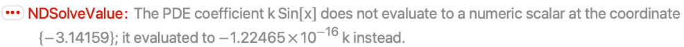 In the preceding case, evaluating the load operator at t=0 and x=-π will let the load operator vanish, and NDSolve cannot detect that k has not been specified:
