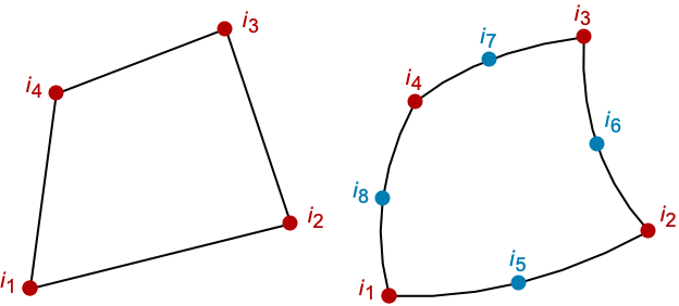 - For quadratic quad elements, the next four incidents are mid-side nodes of possibly curved edges.