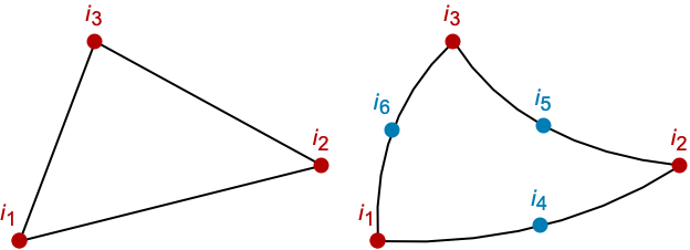 - For quadratic triangle elements, the next three incidents are mid-side nodes of possibly curved edges.
