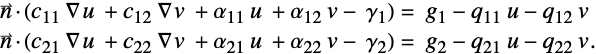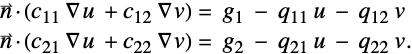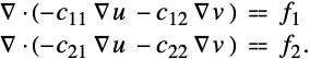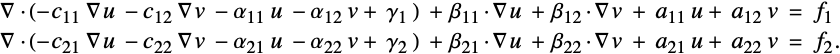 | {op1[u[x1,…],v[x1,…],…] ΓN1,op2[u[x1,…],v[x1,…],…] ΓN2,…,ΓD,ΓP} | system of coupled partial differential equation operators opj, Neumann boundary values ΓNj and Dirichlet and periodic boundary condition equations ΓD and ΓP |