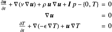 Set up a viscous Navier–Stokes equation that is coupled to a heat equation making use of a Boussinesq approximation. The vectorized equations are given as:
