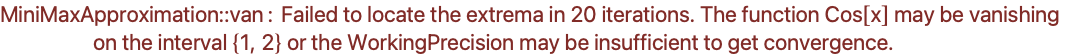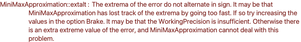 There are several ways in which MiniMaxApproximation can fail. In these cases, you will usually get a message indicating what probably went wrong and what you can do to avoid the problem. For example, if you ask for a minimax approximation of degree (m,k), MiniMaxApproximation will look for a rational minimax approximation such that the relative error oscillates in sign and the extreme values are achieved
