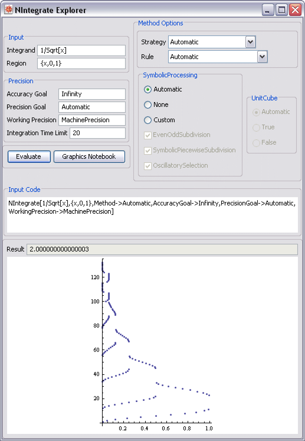 The NIntegrate Explorer is a GUI that lets you do numerical quadrature using NIntegrate. It opens a tool that lets you enter an integrand, set a region, and then modify and change the various option settings for NIntegrate. The result of the computation is shown, along with a graphical display of the function evaluations and the input to NIntegrate that was used.