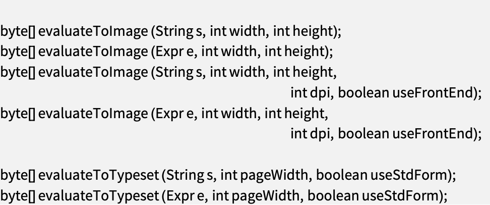 The two most important link interfaces you need to know about are MathLink and KernelLink. The MathLink interface is essentially a port of the WSTP C API into Java. Most of the method names will be familiar to experienced WSTP programmers. KernelLink extends MathLink and adds some important high-level convenience methods that are only meaningful if the other side of the link is a Wolfram Language kernel (for example, the method waitForAnswer(), which assumes the other side of the link will respond with a defined series of packets).