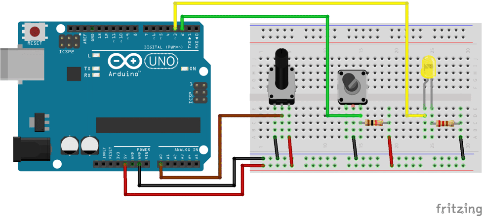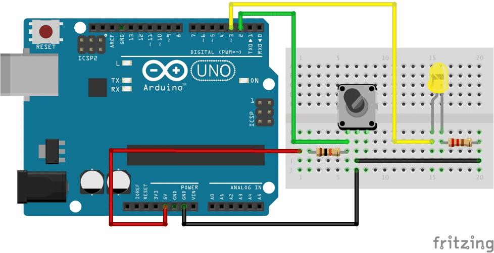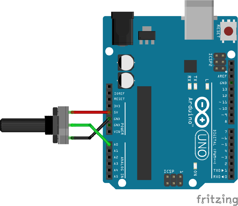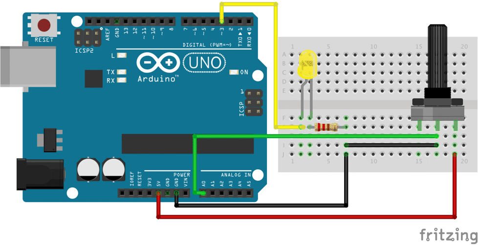 Read the potentiometer connected to "A0" and use it to adjust the brightness of the LED on pin 3: