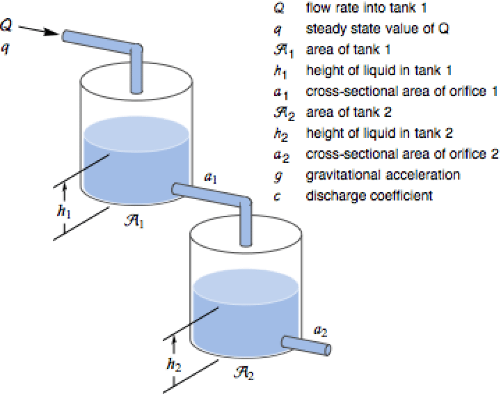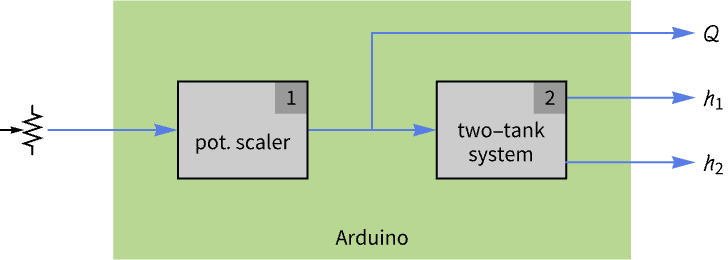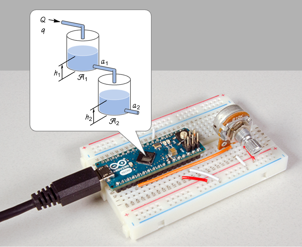 In this project, we will deploy the nonlinear model of a two-tank system to an Arduino Micro microcontroller board. The input to the system is the flow rate into the upper tank. This controls the liquid levels which will be considered as the outputs. A potentiometer will be used to adjust the flow rate, and the liquid levels will be output as serial-over-usb signals. This can then be read using the device framework. Thus we can simulate and analyze the behavior of the two-tank system in real-time.