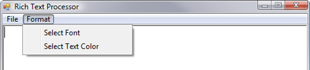 Start off by creating a Windows Form, that is, a "window"; you can add controls such as menus to such a form: