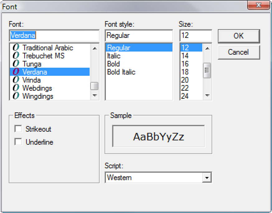 Clicking the Select Font menu item calls the Windows Font dialog when text is selected: