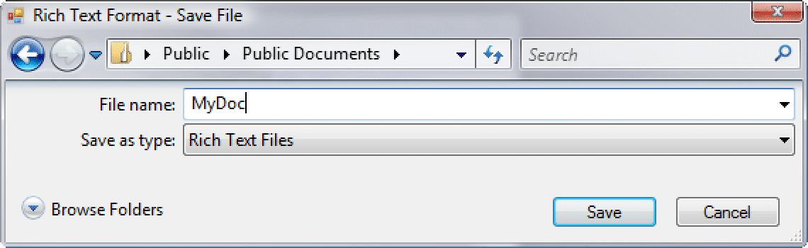 Clicking the Save As menu item will open a file browser to save a rich or plain text document: