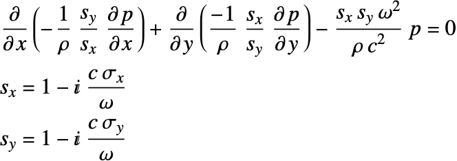 To describe the propagation of harmonic sound waves, the Helmholtz partial differential equation (PDE) is used. Since an infinitely extended domain is needed, the Helmholtz equation is transformed with a perfectly matched layer (PML). The derivation and the theoretical background of the perfectly matched layer (PML) can be found in the acoustics frequency domain tutorial. The transformation of the Helmholtz equation with the perfectly matched layer results in the following equation: