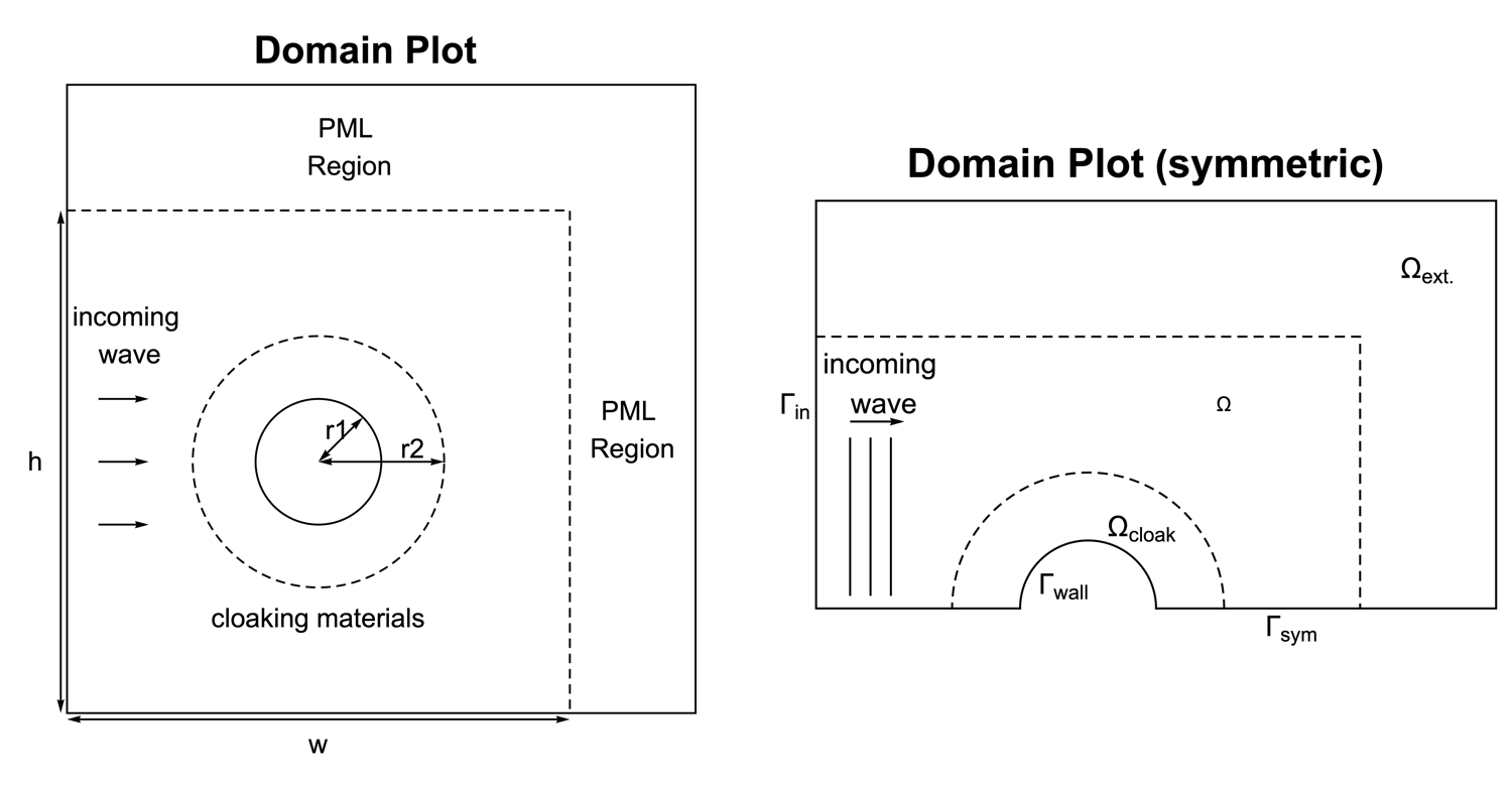 The following model simulates a right-going acoustic wave incident on a hard-walled cylinder. The simulation will be performed with and without the cloak. The resulting sound-scattering patterns will then be compared to quantify the effectiveness of the acoustic cloak.