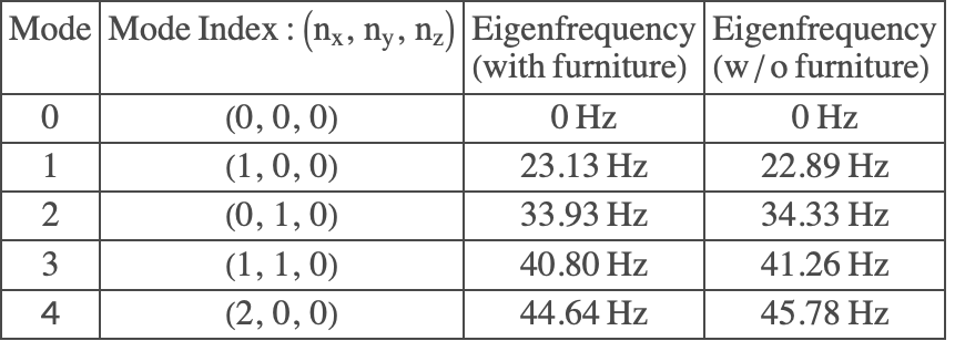 The following table summarizes the first five eigenfrequencies of the furnished room and the empty room. By convention, the first nonzero eigenfrequency is denoted as mode 1 and is called the fundamental frequency or the first harmonic of the room.