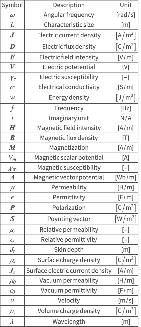 The following sections of this notebook focus on the general background that these subcases of electromagnetics have in common, such as the Maxwell's equations, the constitutive relations, potentials, phasors and boundary conditions.