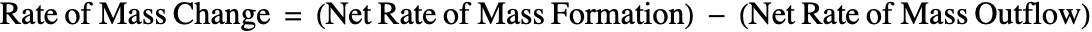 To derive the mass balance equation, start from the law of mass conservation. In a system, the total mass change must be equal to net mass formation minus the net mass outflow flow. A mass balance can then be expressed as: