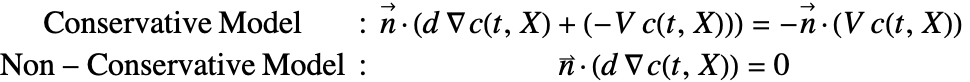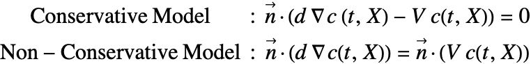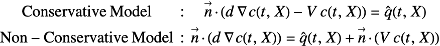 This tutorial focuses on incompressible fluid media, and the non-conservative mass balance equation (13) will be used as the default PDE setup for the mass transport model. However, the later section Boundary Conditions in Mass Transport presents the boundary condition setup for both the conservative and the non-conservative formulations.