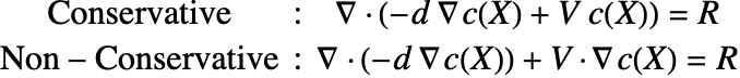 . The difference between the conservative and the non-conservative forms is explained in the section Mass Balance Equation Derivation. In either case, this term is only present if mass transport occurs in a fluid medium with a fluid flow velocity