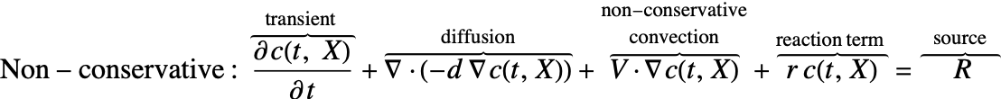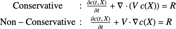 As presented in the section Mass Balance Equation Derivation, the conservative and non-conservative forms of the mass balance equation are given by: