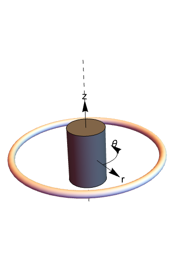 On the left: a simulation domain of a 3D cylinder placed inside a 3D coil in a cylindrical coordinate system. To the right: a cross-sectional area of the coil and cylinder and its surrounding volume in the
