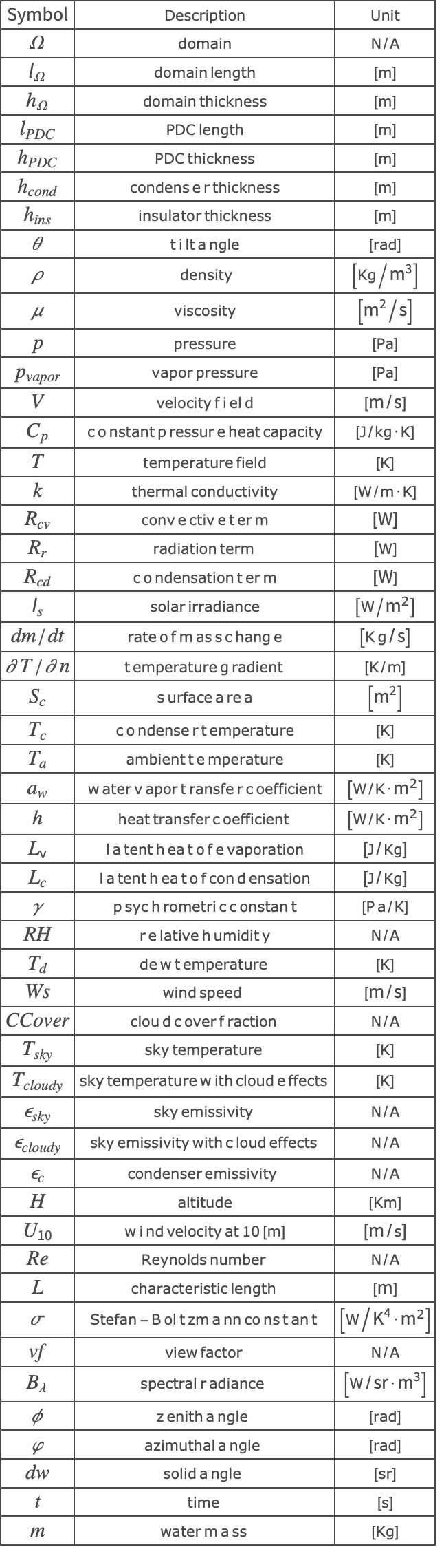 The PDC device that will be used here is a planar PDC positioned at a 30° angle from the horizontal plane. A PDC is mainly composed of a condenser surface on top of an insulating material. The characteristics of the condenser surface, such as emissivity and heat capacity, will be of great importance, as they affect how much water is condensed [Flores-Castillo, 2022].