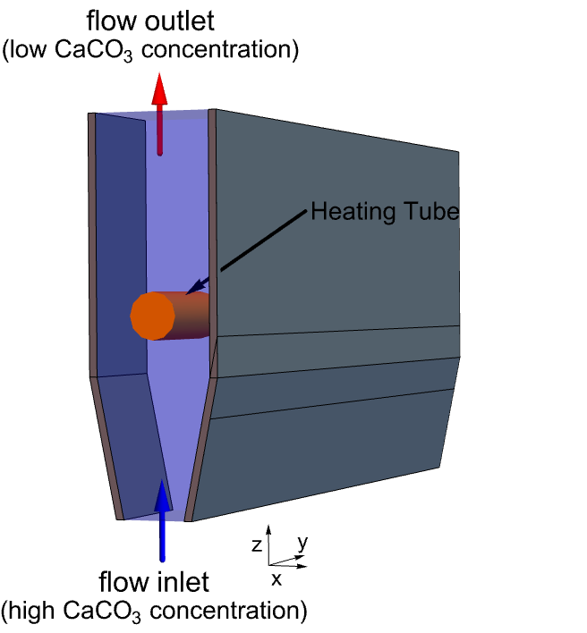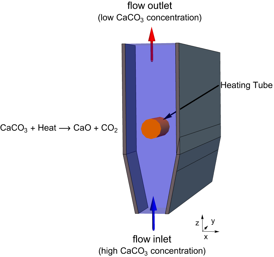 This study is to model the decomposition process of calcium carbonate and simulate its concentration field within an expanding reactor. The calcium carbonate is transported into the reactor by suspending it in water that enters the domain from the bottom, flows across a heated tube and exits the reactor through the top. During this process, the calcium carbonate particles decompose and absorb heat from the system.