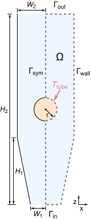 denote the flow inlet and flow outlet. The wall boundary and the symmetric axis are symbolized as