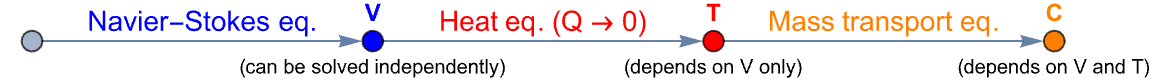 This one-way coupled multiphysics model can either be solved sequentially or in one go. Solving it sequentially would mean that each of the physics domains is solved with a separate call to NDSolve. This approach of splitting the coupled equations in chunks and solving them independently and sequentially is called a segregated solution process. In case the single physics fields cannot be split easily, an initial guess for the coupling variable of the first PDE is made. Then the solution of the first PDE is taken to drive the next PDE and so forth. Once all PDEs have been solved, the process is started over again. This will improve the initial guess for the initial coupling variable. This procedure is executed until the solution converges.