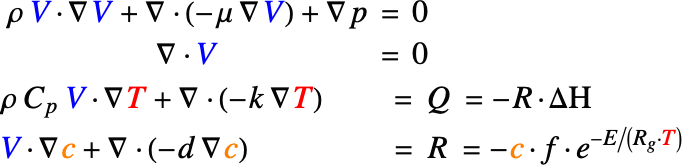 To solve a two-way coupled nonlinear PDE system like this, a possible strategy is to first solve a simpler model with a weaker nonlinearity and use the solution of the simpler model as an initial guess for the full nonlinear model. Ignoring the heat generated by the reaction gives a good simpler model to start with. This approach is detailed in the following sections.