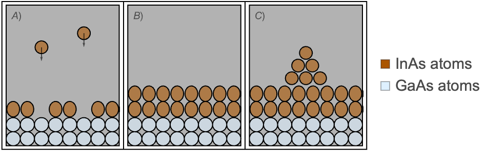 . As a thin layer is being grown and the material conforms to the substrate's crystal structure, strain starts to build up, eventually leading to the formation of self-assembled islands when a critical thickness, usually of a few nanometers, is reached (see subfigures B) and C) of Figure 1).