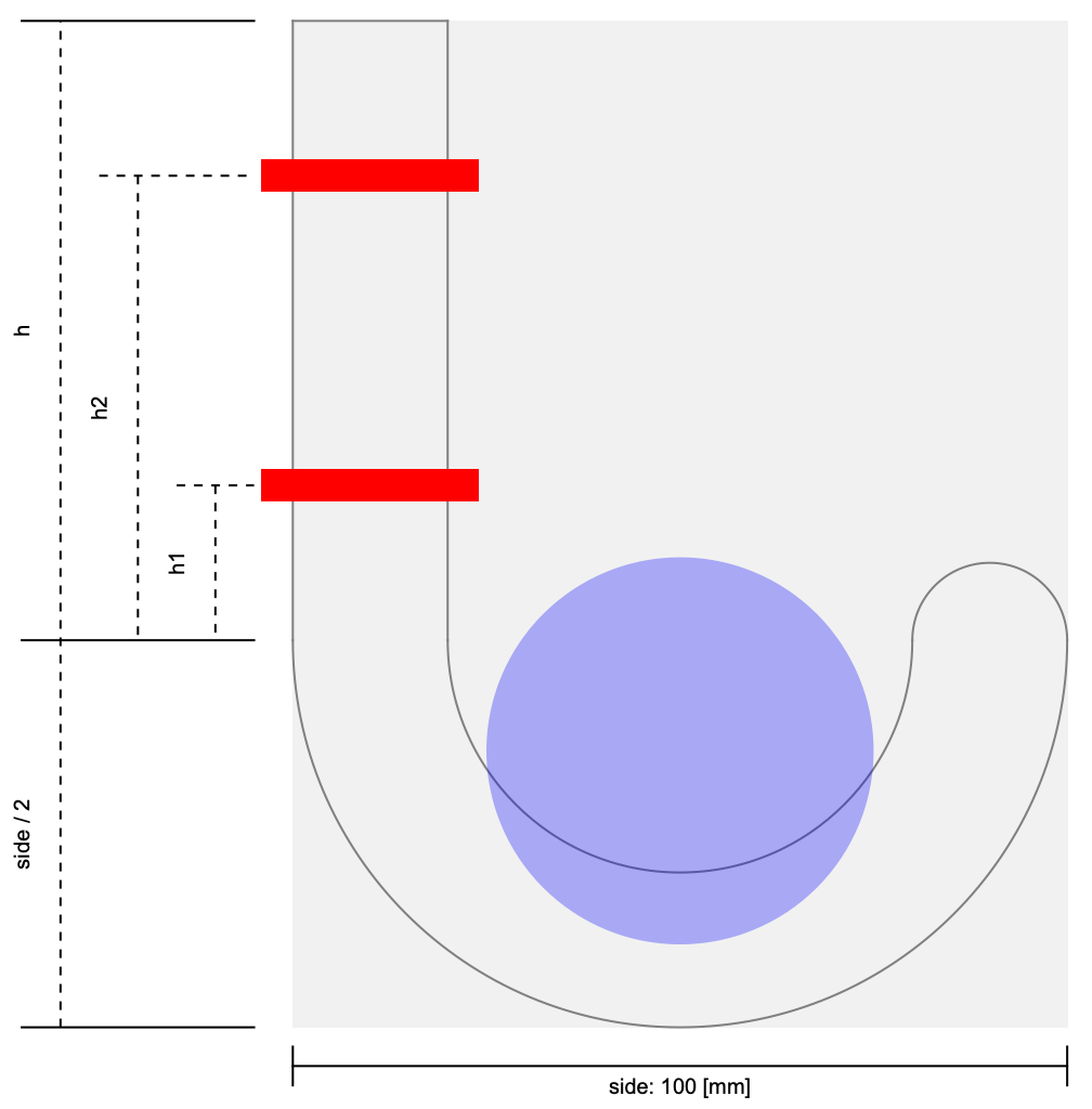 The primary design constraints for the hook include the position and diameter of the fixation holes, as well as the maximum allowable spacing between the fixation surface and the opposite extremity, referred to as the side in the figure below. The hook must be capable of withstanding a predefined load of 1200 [N], while allowing only minimal displacements. Although some deformation is acceptable, it should be kept as low as possible to ensure functional stability.