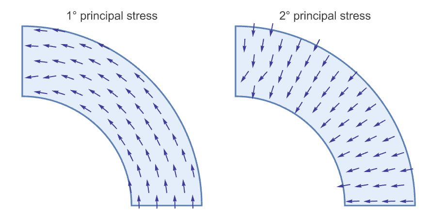 is 0. For more information on the principal stresses, see the section on Principal Directions in the Solid Mechanics monograph. By plotting the principal stress direction, it is possible to show how the first one is directed tangentially to the annulus and is related to the stretch across the concentric circumferences. Moreover, the second principal direction appears across the radial direction and the second principal stress is mainly related to the internal boundary pressure and decreases to zero going outward. The following plots show the principal direction, while the stress values are shown in the following comparison or explained by the previous analytical solution.