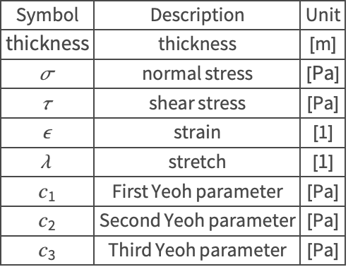 The Yeoh hyperelastic constitutive model is a phenomenological model for representing the deformation of an isotropic, nearly incompressible, nonlinear elastic material such as rubber or biological tissues. The model is described by a strain energy density function represented as a power series of the strain invariant.