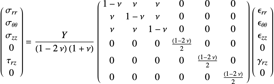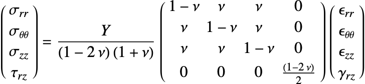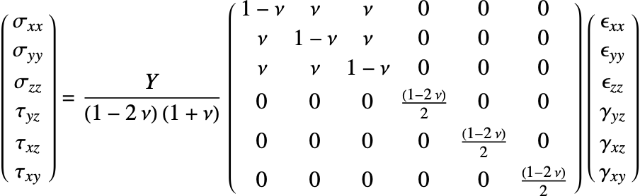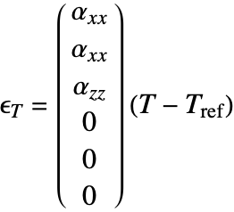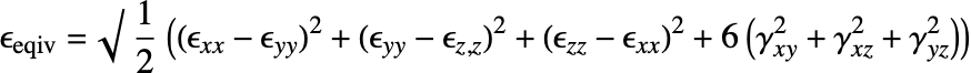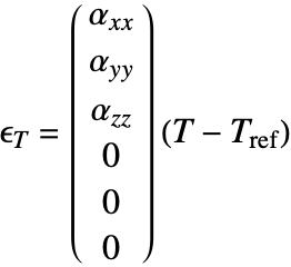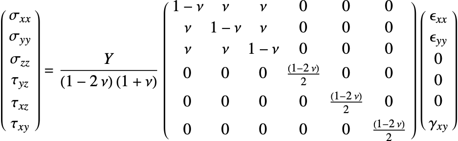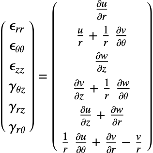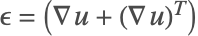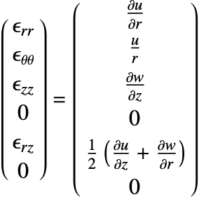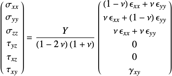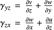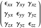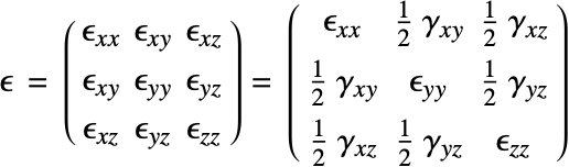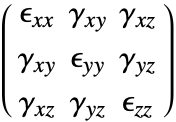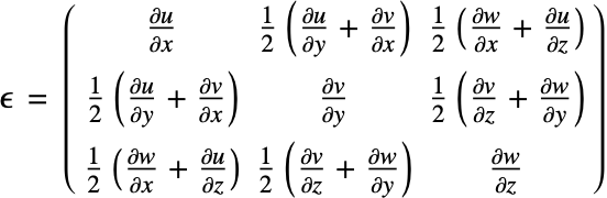 The SolidMechanicsStrain function computes the normal and shear strains for each independent direction. The function returns a SymmetrizedArray that contains an expression representing the strain components in the various directions. The SymmetrizedArray enforces symmetry when present and is compact. The strains returned have the following order: