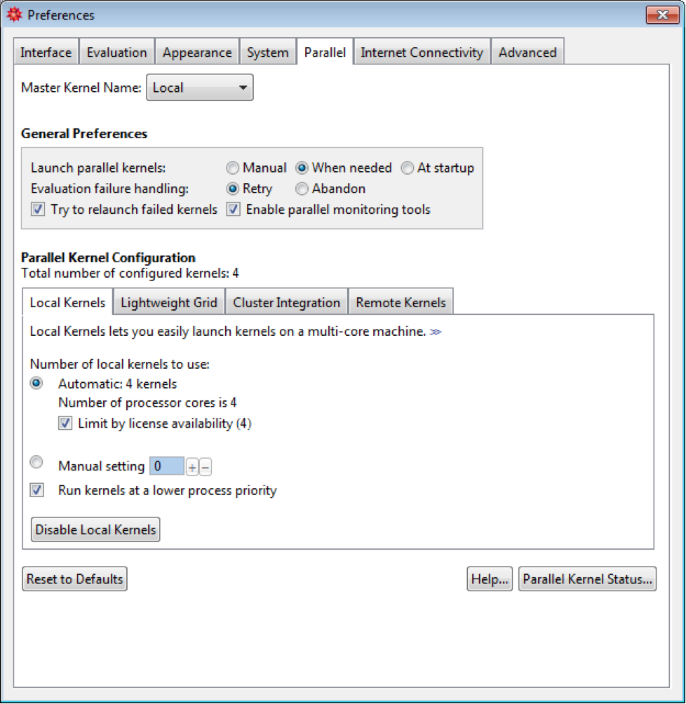 The Parallel Kernel Configuration tabs control how the Wolfram Language launches and communicates with parallel kernels. The default connection method is to use Local Kernels, which runs kernels on the same computer as the main Wolfram Language kernel. By default, this will launch the same number of kernels as you have cores on your computer; this is specified by $ProcessorCount. Other connection methods are provided that work with kernels that run on remote computers in some type of grid or network. You can find more information in "Connection Methods". Some of these methods require additional software on your local computer and generally require a Wolfram System installation on the remote computers you wish to use.