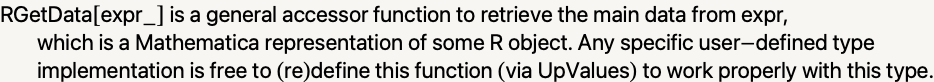 RLink does not support all core data types present in R. However, most of those data types that it does not support are usually not used for anything by the user (or, are used in rather special circumstances), and are mostly needed for R itself. In any case, it is useful to be able to import into the Wolfram Language arbitrary R objects, whether or not they contain objects of unsupported data types as their elements. To do that, RLink uses the following strategy: when it sees an object of such an unsupported type, it constructs a string code representation of that object, so that when this string is parsed and evaluated on the R side (R functions parse and eval), the original R object gets reconstructed. The R function deparse is used to construct such a string. Not all R objects will be correctly reconstructed by this procedure (environments are one notable exception and cannot be deparsed), but most will. The resulting deparsed code string is returned to the Wolfram Language, wrapped in an RCode wrapper.