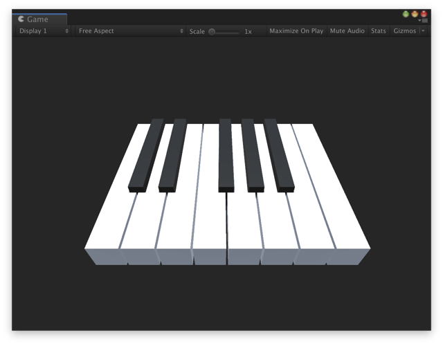 Create the piano key game objects and assign the corresponding meshes, audio clips, and key codes.