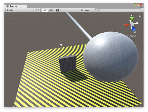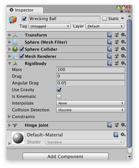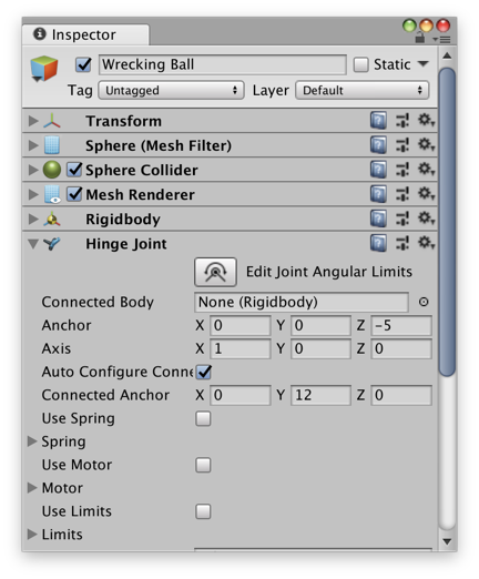 Attach a hinge component to the wrecking ball and set its anchor to be above the wall: