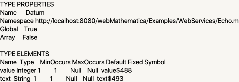 Web Services Link generates symbols that are used to build compound data types. Compound data types are Wolfram Language expressions that contain instances of simple data types and/or compound data types. Compound data types are created in the Wolfram Language using a symbol representing the data type as the head of a Wolfram Language expression. The members of the data type are represented using rules in the body of the expression. The left-hand side of the rule specifies the name of a member of the data type. The right-hand side specifies the value of the member. The value may be a simple or compound value.