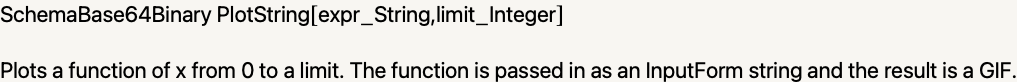 In the Plot example, PlotString takes a string and an integer as parameters and returns a base64 binary string. The function converts the string into a Wolfram Language expression and then plots this as a function of