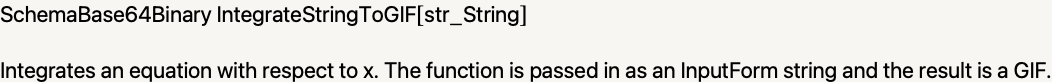The following example demonstrates using images to communicate mathematical data. The service returns a list of base64 binary bytes wrapped in a head of SchemaBase64Binary. This head is used to identify this data as base64 binary. FromCharacterCode can be used to decode the base64 binary data into a string consisting of GIF data. This string may be imported to a GIF with ImportString.