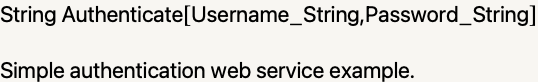 Authentication is used by some web services to validate a user. This is based on functionality provided by HTTP. Digest and basic authentication are supported. A user can set the username and password by using the Username and Password options. These can be passed into any web service function and used for authentication.