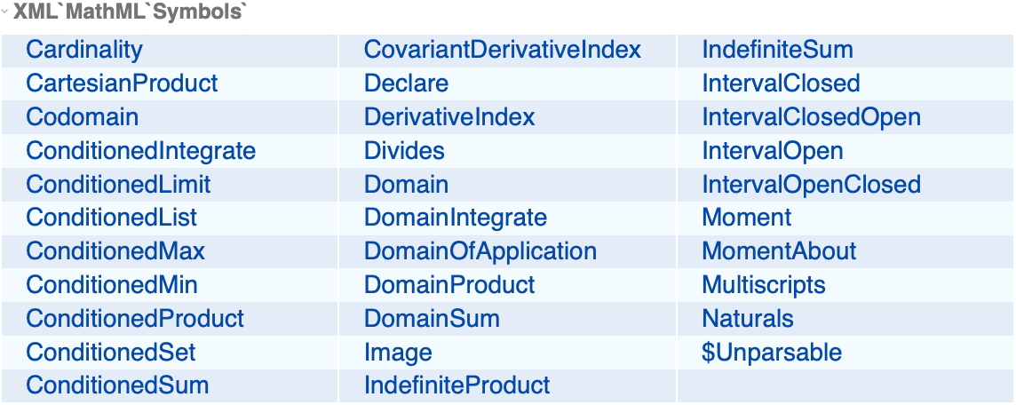 Since certain content elements in MathML do not have a direct analog in the Wolfram Language, a few symbols are specially defined in the XML`MathML` context.