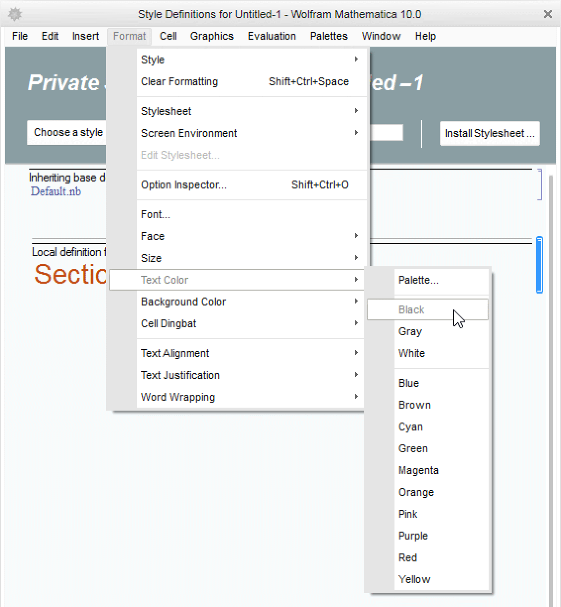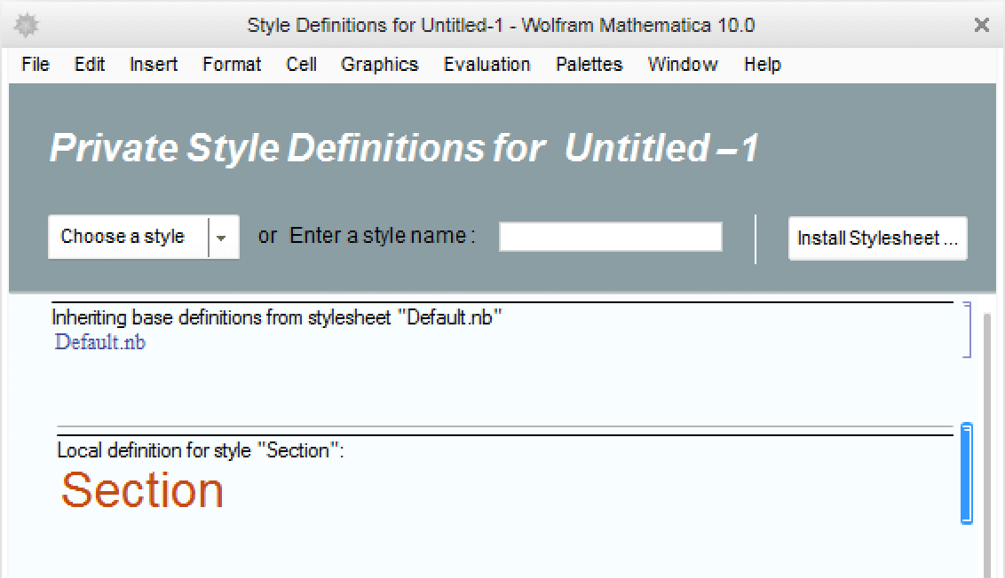 A stylesheet is essentially just another notebook containing cells of a special type recognized by the system as style definitions. Any cells of that type added here affect the appearance or behavior of cells in the actual document that are set to the same style name. Edited in this example is Section, a common style available in the Choose a style pop-up menu. Select Section from the menu and the style cell for it is inserted into the main editing area, where it is labeled "Local definition for style Section".